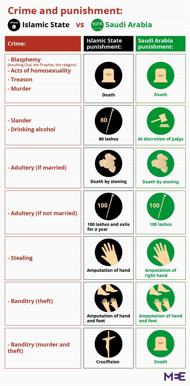Let’s talk about the 110 people beheaded by August this year. ISIS (or the Islamic State, as they call themselves) beheaded 65. In fact, let’s see how Saudi Arabia compares with ISIS when it comes to punishment, shall we?