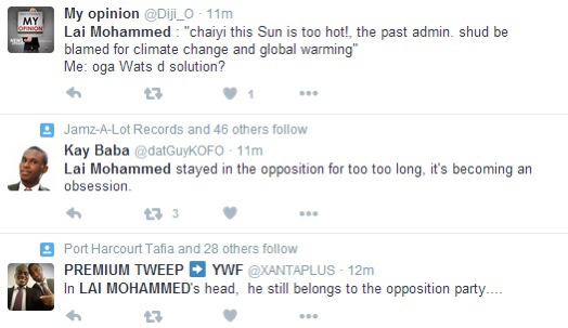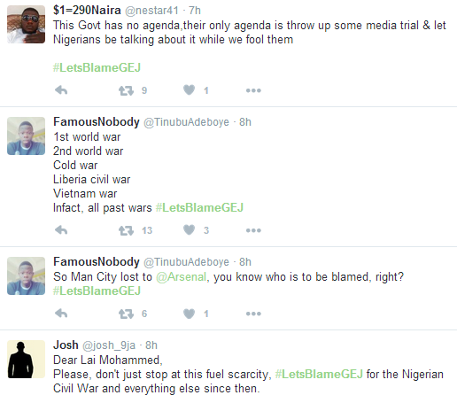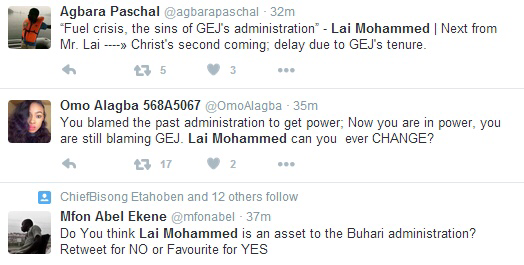 Nigerians have taken to twitter to react to the statement made by Lai Mohammed yesterday where he blamed former President Jonathan’s administration for the current 58 days old fuel scarcity.