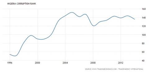 The graph below shows Nigeria’s Corruption Perceptions Index rankings from 1996 to 2014