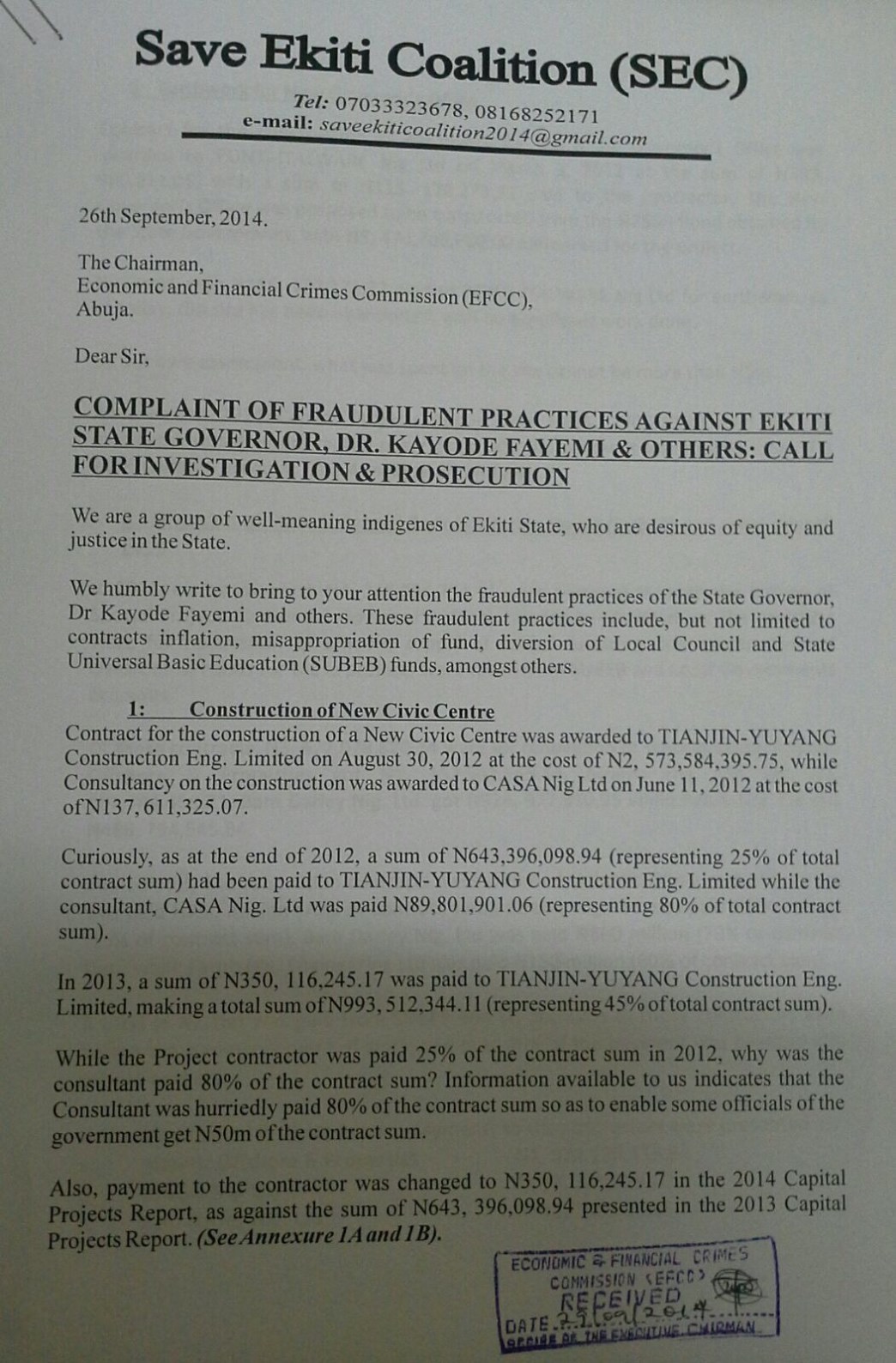 The petition read in part; “Contract for the construction of a New Civic Centre was awarded to TIANJIN-YUYANG Construction Eng. Limited on August 30, 2012 at the cost of N2, 573,584,395.75, while Consultancy on the construction was awarded to CASA Nig Ltd on June 11, 2012 at the cost of N137, 611,325.07.