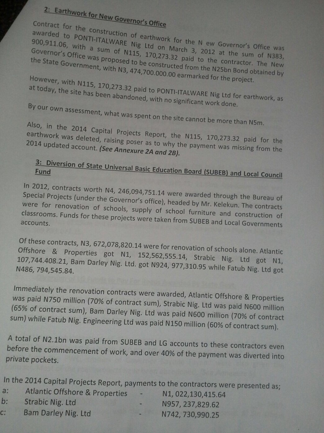 “In the 2014 Capital Projects Report, payments to the contractors were presented as; a: Atlantic Offshore & Properties – N1, 022,130,415.64; b: Strabic Nig. Ltd – N957, 237,829.62; c: Bam Darley Nig. Ltd – N742, 730,990.25; and d: Fatub Engineering Nig. Ltd – N431, 327,270.41.