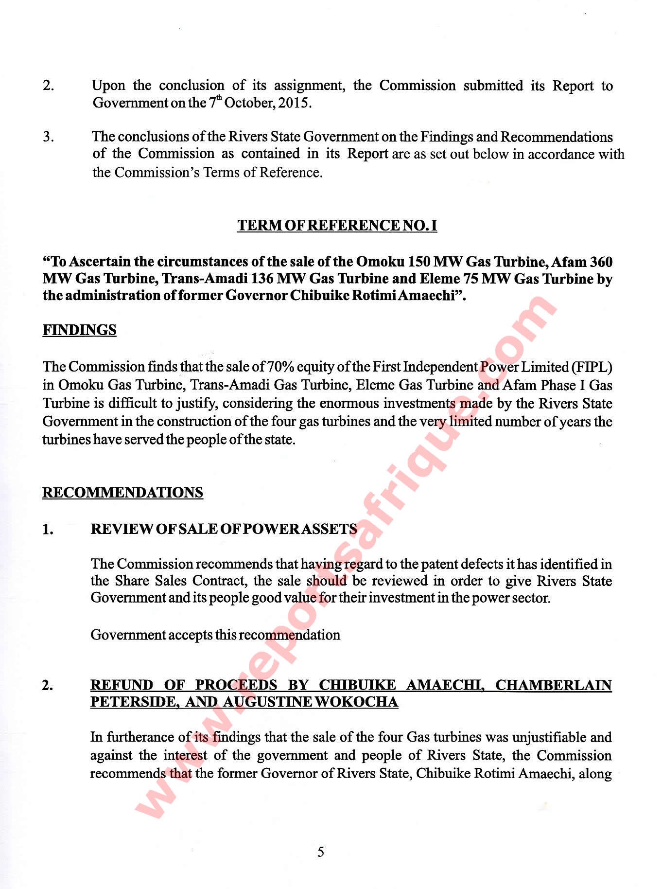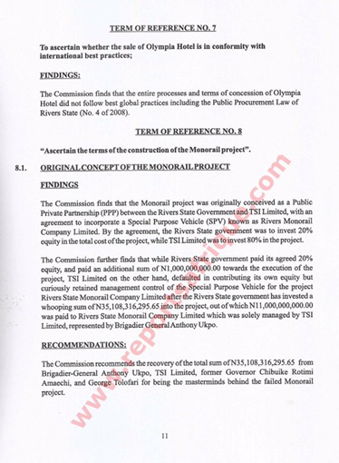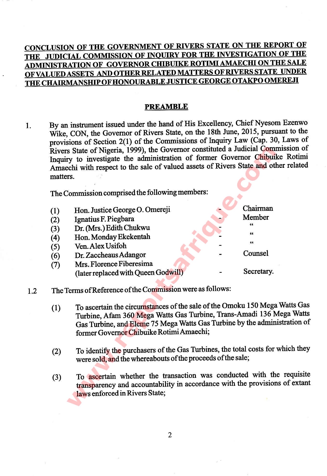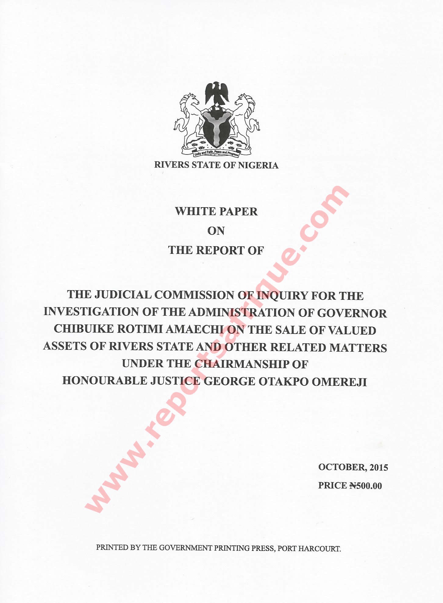 The Rivers State Government set up a Judicial Commission of Inquiry to investigate Amaechi’s tenure as governor. The Judicial Commission was chaired by Honourable Justice George Omereji and it submitted its report in October 2015.