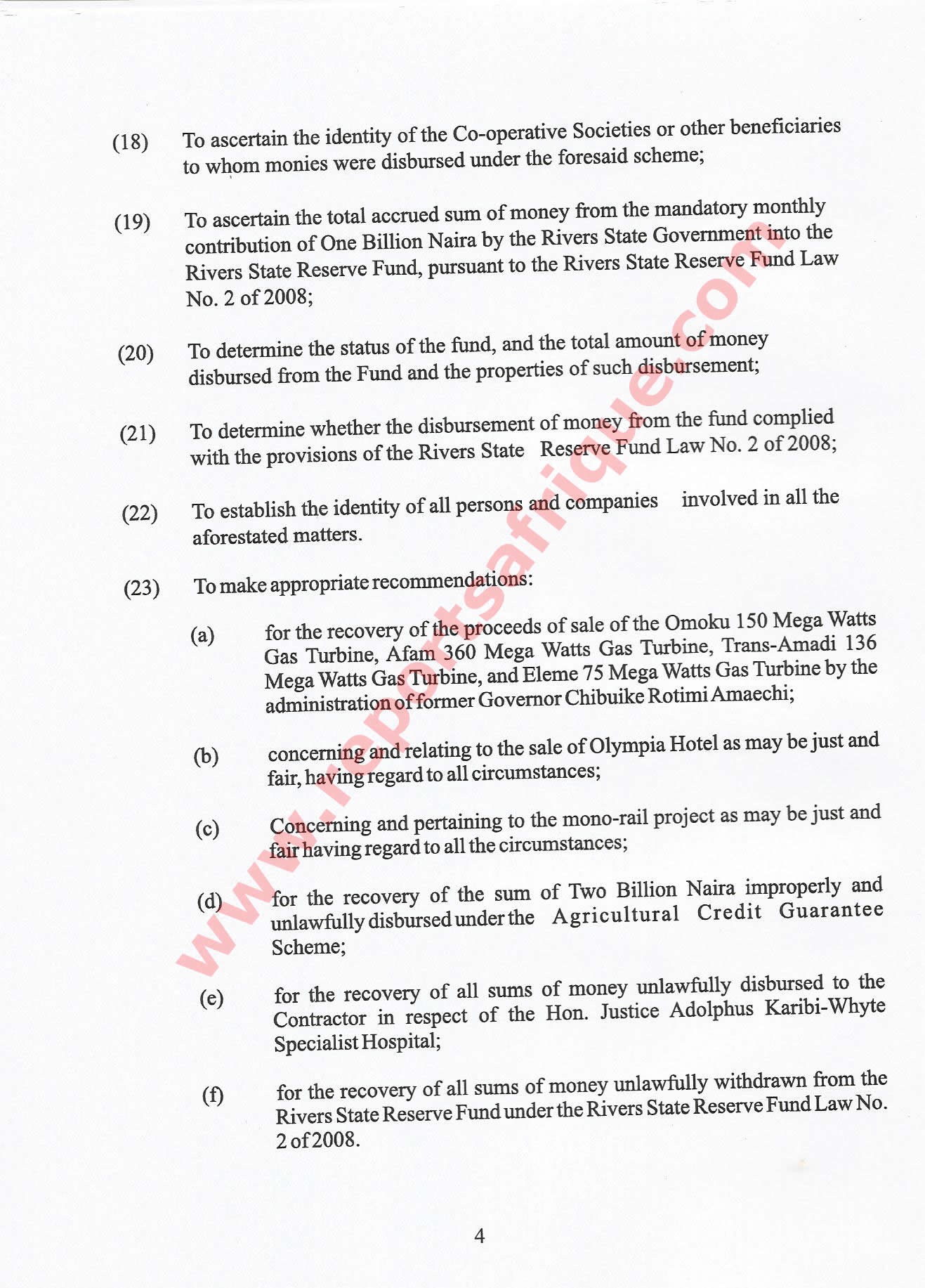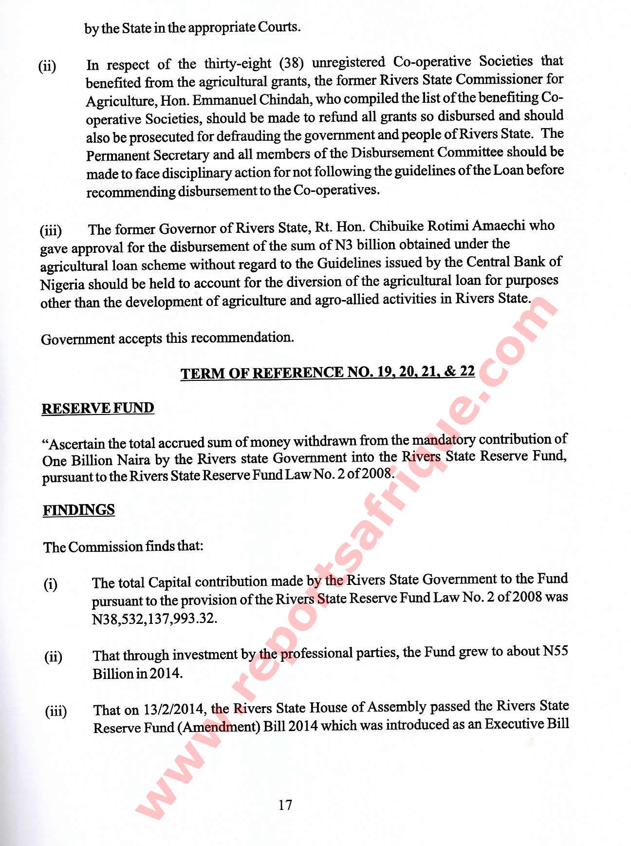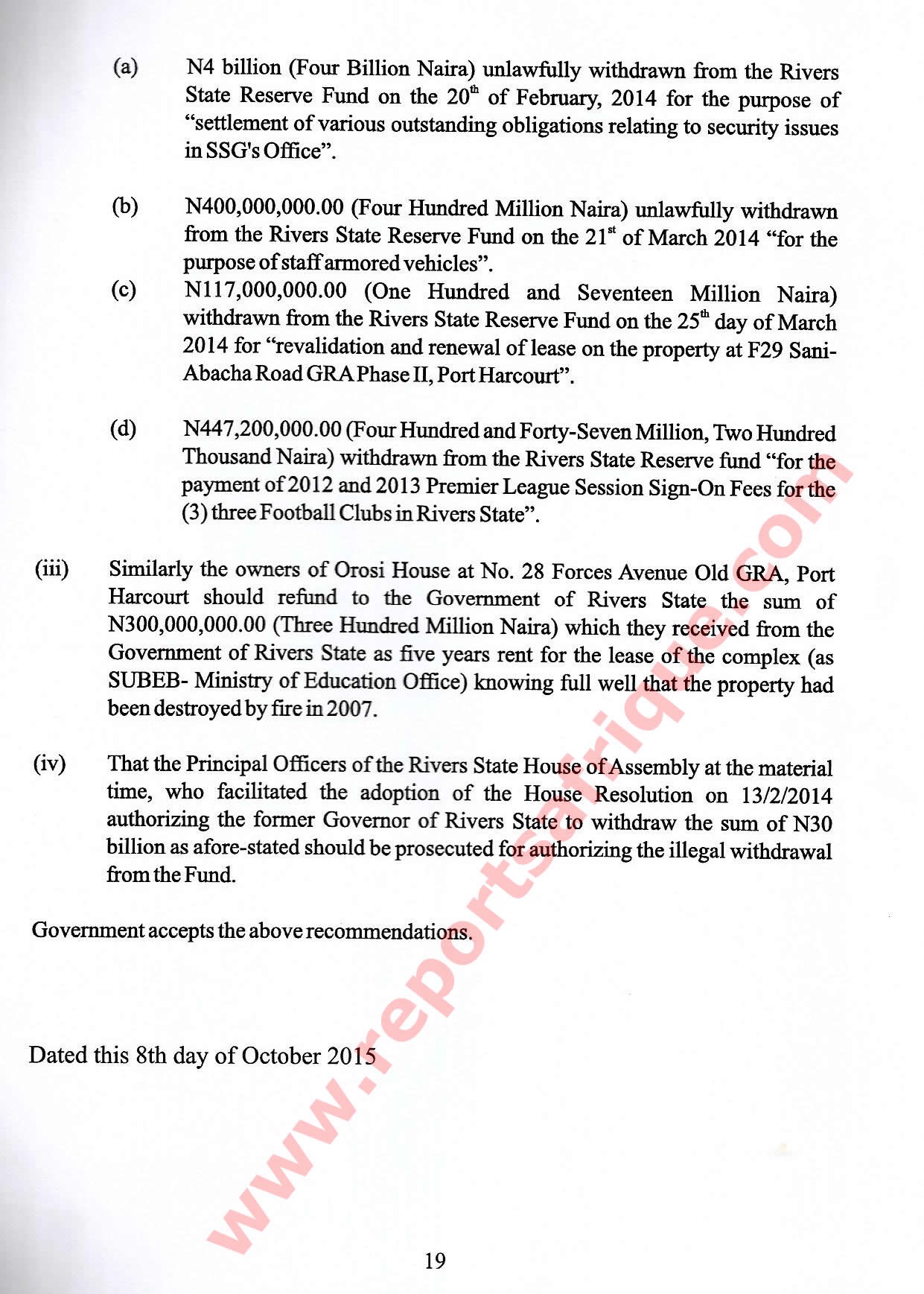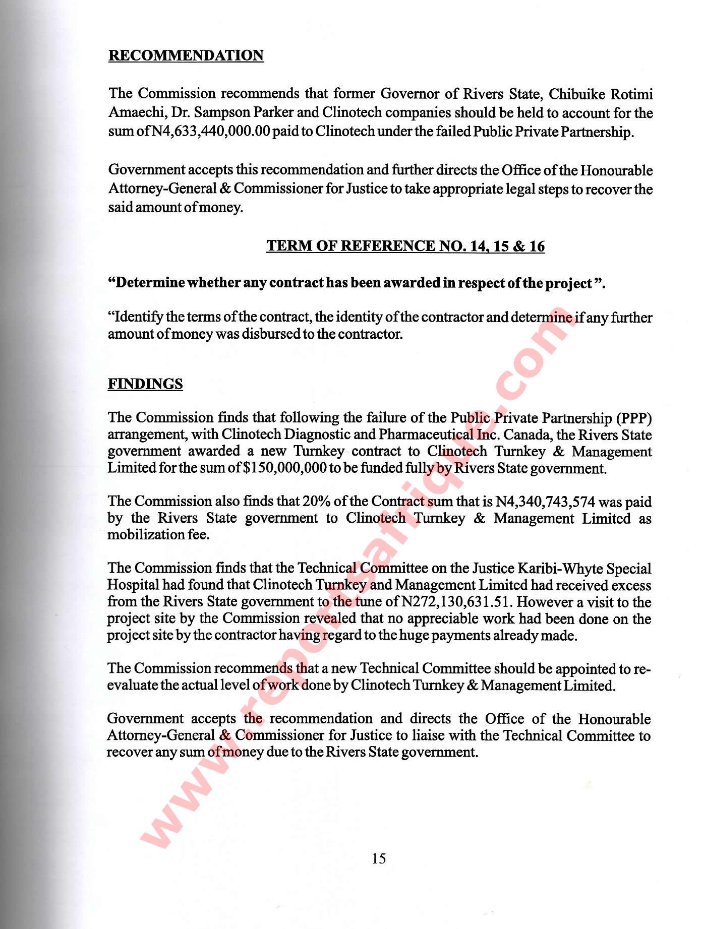 The Rivers State Government set up a Judicial Commission of Inquiry to investigate Amaechi’s tenure as governor. The Judicial Commission was chaired by Honourable Justice George Omereji and it submitted its report in October 2015.