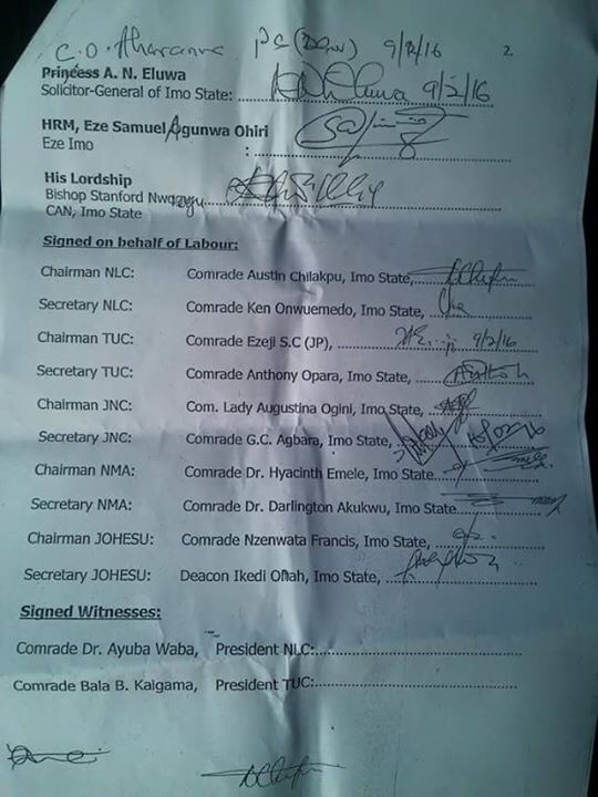 In an agreement signed after talks by the ‘Committee on Joint Government-Labour Negotiation in Imo State’, an immediate recall of all suspended workers of Imo State was recommended, “notwithstanding that the parastatals in the opinion of Government should have been more productive”.