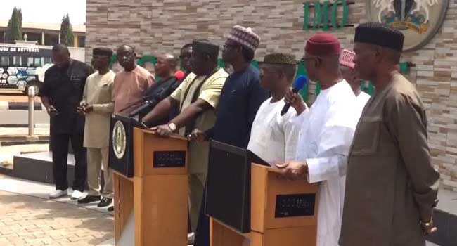 Officials of the Imo State Government and the leader of the All Progressives Congress addressing the labour union after talks held to resolve the issues