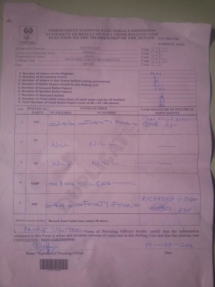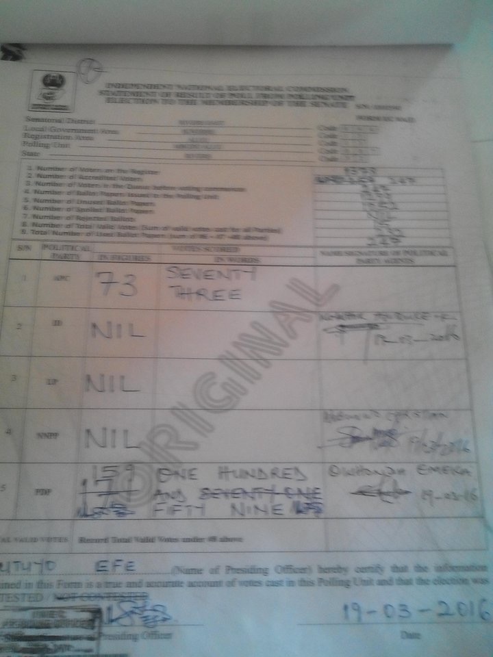 SENATE Result for Unit 3 Ward 14 Akuku-Toru LGA: