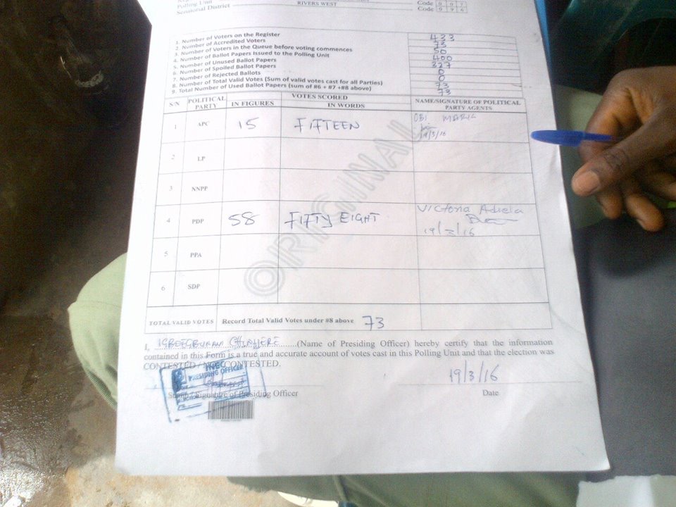 Result sheet from Oyibo LGA, Unit 11, Ward 9 for