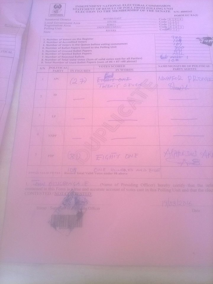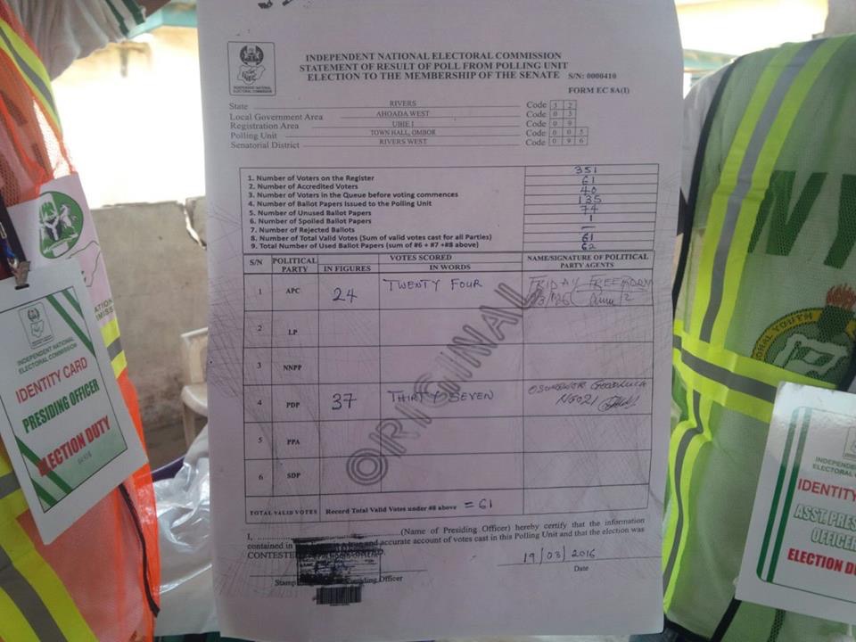 SENATE Result for Unit 3 Ward 14 Akuku-Toru LGA:
