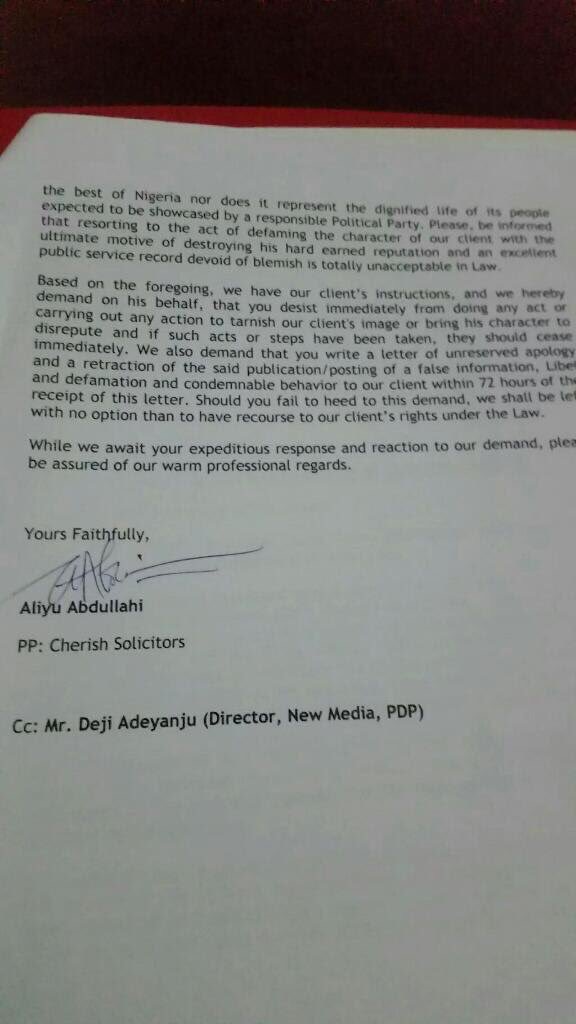 Lawyers of Garba Shehu, the Senior Special Assistant on Media and Publicity to the president, have written to PDP, threatening to sue them if they don’t apologize and withdraw their accusations within 72 hours.