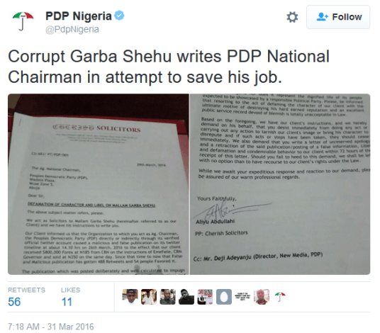The official twitter handle of PDP last week accused Garba of illegally trading in foreign exchange, claiming he bought $800, 000 from CBN at official rate, and selling it off the same day at black market rate. Read Garbas representatives letter after the cut..