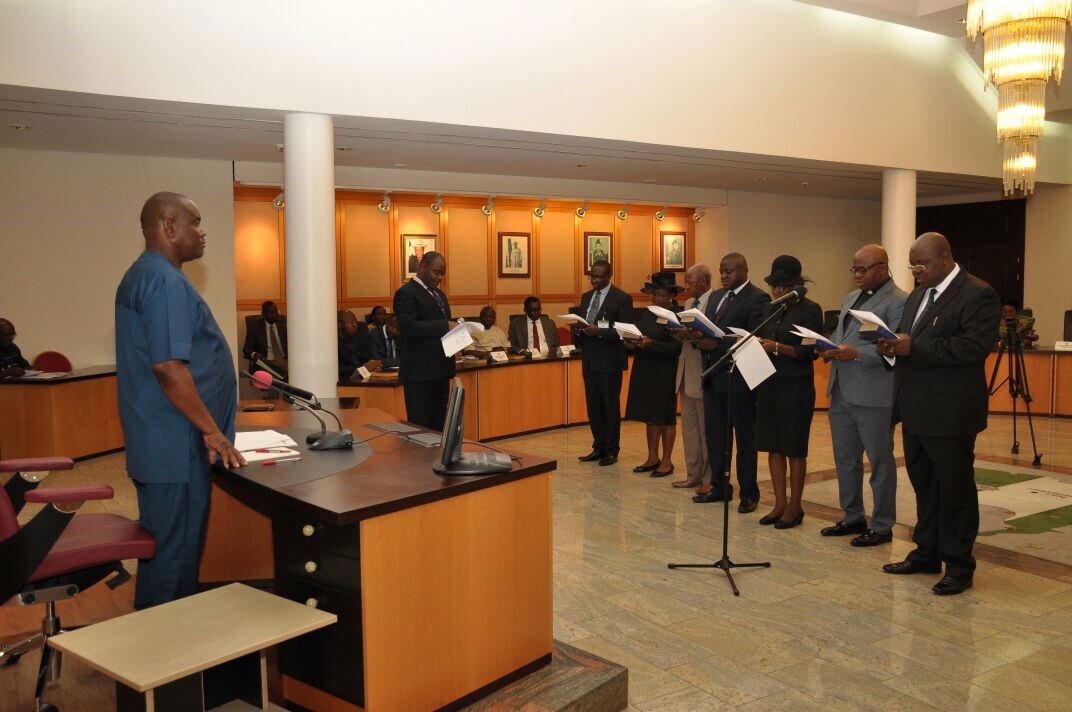 Rivers State Governor, Nyesom Ezenwo Wike swearing in the Justice Monima Wenike Danagogo led Judicial Commission of Inquiry into the violence/killings during the March 19 re-run elections on Wednesday at Government House, Port Harcourt. Rivers State Governor, Nyesom Ezenwo Wike on Wednesday swore in the Judicial Commission of Inquiry into the violence / killings…
