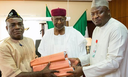 Chief of Staff to President Buhari Abba Kyari receives budget from Senior Special Assistant to President on National Assembly matters Senator Eta Enang and Hon. Kawu Ismaila in Statehouse on 7th April 2016