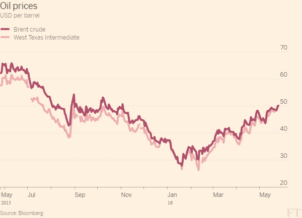 ICE July Brent crude rose as much as 1 per cent to $50.51 a barrel on Thursday in London and US benchmark West Texas Intermediate also topped $50, rising 0.7 per cent to $50.21. They later pared gains and dropped below $50 a barrel.