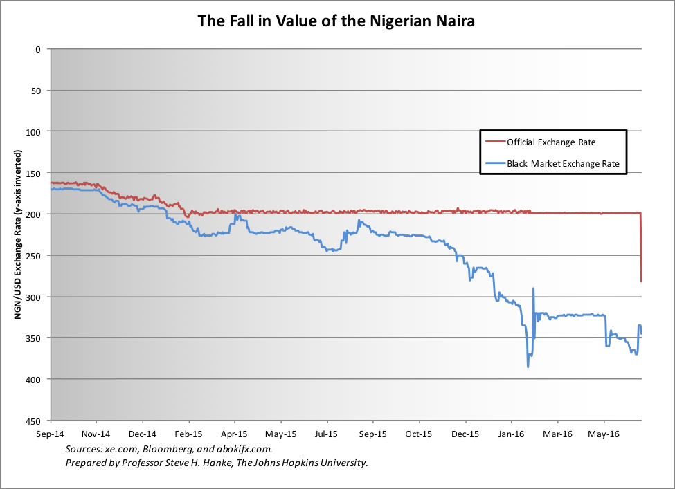On Monday afternoon, the Central Bank of Nigeria (CBN) ended the Nigerian naira’s sixteen-month peg to the U.S. dollar, sending the naira into a freefall. The currency had been pegged at 197 naira per dollar, but as the chart below shows, it had been trading at over 320 naira per dollar for months on the black market (read: free market) and currently sits at 345 naira per dollar. At the time of writing, the naira was officially trading at 282.50 naira per dollar.