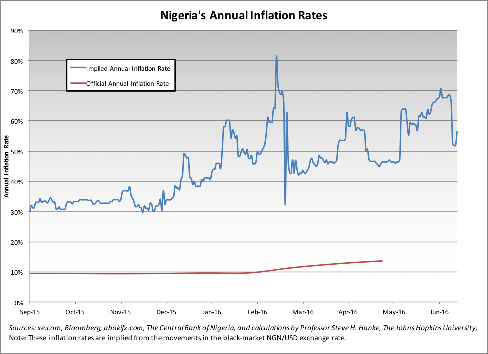 The official inflation rate for Nigeria in May was 15.6 percent. However, by using changes in the black market exchange rate data and applying the Purchasing Power Parity Theory, I calculate that the annual inflation rate implied by the free market is actually much higher – currently sitting at over 56 percent (see the accompanying chart).