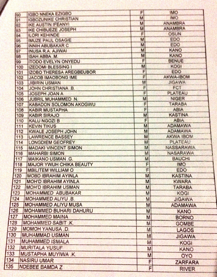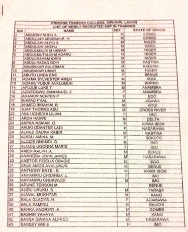 Sources leaked two separate lists of names of new recruits who were to undergo new hire training in Lagos or Kaduna. The title of the first list is “List of Newly Recruited ASP in Training” and that it is to take place at the Prisons Training College in Kiri-Kiri, Lagos State. The second list is titled “List of Newly Recruited Trainees June 2016” and that it is to take place at Prisons Training School in Kaduna State.