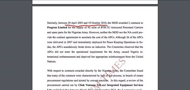 “Similarly, between 29 April 2005 and 19 October 2010, the MOD (Ministry of Defence) awarded 2 contracts to Progress Limited for the supply of 42 units of BTR-3U Armoured Personnel Carriers and spare parts for the Nigerian Army.