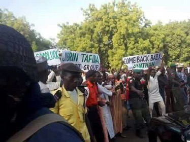 The highlight of the day was the build up of a surprise placard wielding crowd chanting “come back Baba Jonathan”.