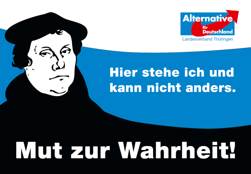 Protestantism is no rooted in the political essence of Germany, that till this day Luther is used for populist movements. For example, the rising Alternative for Germany party (AfD) presents posters with Luther’s portrait adjacent to his infamous words: Here I stand, I cannot do otherwise (Hier steje ich und kann nicht anders), alongside the slogan: “Courage to Truth” (Mut zur Wahrheit):