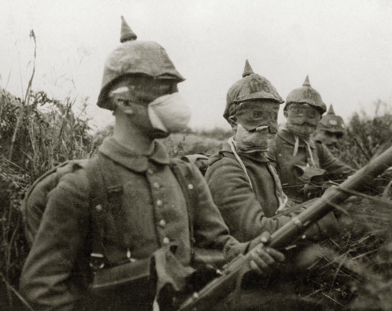 German soldiers of the Infantry Regiment 106 with gas masks in a trench on the Western Front during WWI, 1915