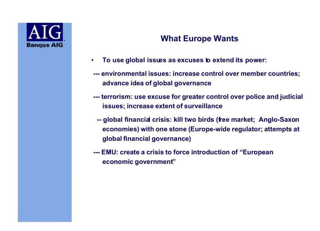 But, this was part of the plan all along behind the immigration crises. The officials of the EU knew very well the consequences that would transpire behind bringing in millions of people from the Islamic world; they knew very well that it would lead to terrorism, and to Nazis capitalizing on the situation to leverage support and establish influence. They also knew very well, that with terrorism comes a justification to increase government power, advance military capacity, and commence arms races within Europe. This observation was in fact affirmed by a report made by AIG back in 2008. It was written by economist Bernard Connolly, a global strategist for Banque AIG and AIG Trading, who worked in the Industrial Trends and Forecasting Unit of the Confederation of British Industry, and who worked for years for the European Commission in Brussels, where he was head of the unit responsible for the European Monetary System and monetary policies. In the report, entitled Europe – Driver or Driven?, Connolly presented a bullet point list of objectives in which he wrote: “Europe Wants… terrorism: use excuse for greater control over police and judicial issues; increase extent of surveillance”, and here is the page of the actual report: