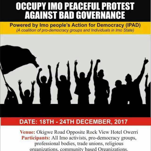 The Imo Peoples Action for Democracy (IPAD) has noted with dismay the plot by the Imo State government to use the Imo state command of the Nigerian police to scuttle our peaceful rally scheduled to commence on the 18th of December 2017 in Owerri. As a responsible organization we had earlier written to both the Nigerian Police and the Department of State Services to inform them of our rally and for them to carry out their constitutional obligation of providing protection for the rally. While the later saw no problem in a peaceful rally, the former could not conform to the provisions of the constitution. The Imo State command of the Nigerian police which the public presently perceive as compromised by the Imo state government, expectedly raised objection to our peaceful rally citing flimsy reasons. After a careful review of this development we therefore state as follows: