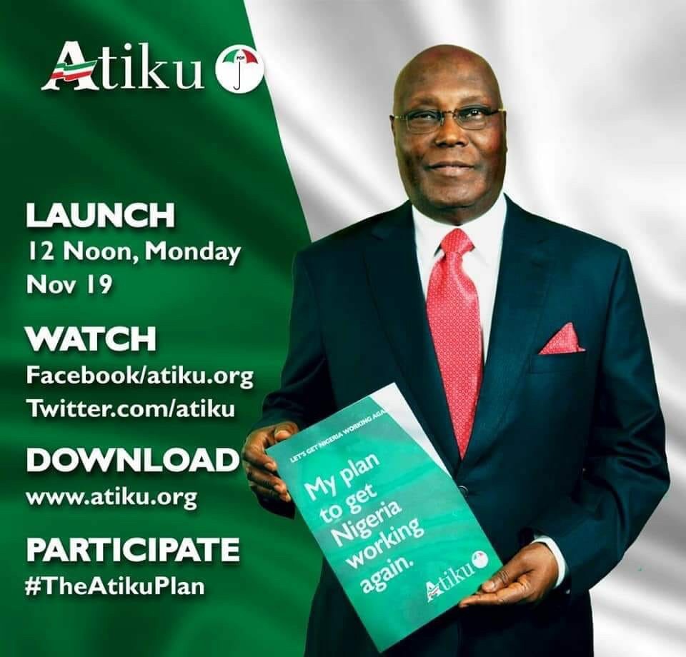 The presidential candidate of the Peoples Democratic Party (PDP) and former Vice President of Nigeria, Atiku Abubakar will kick-start his campaign for president in the 2019 election through an address to the Nigerian people on Facebook at 12 noon on Monday where he will launch his policy document.