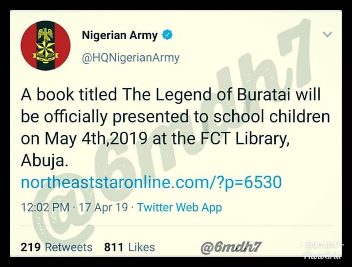 General Sir, Nigerians woke up yesterday morning to a tweet on the verified handle of the Nigerian Army stating that come May 4th, 2019, a book titled “The Legend of Buratai” would be officially presented to school children at the federal capital territory library, Abuja. According to the report, the book written by one Dr Abubakar Mohd Sani is “a calculated attempt to transform his (Buratai) life into folklore for lovers of literature and school children”.