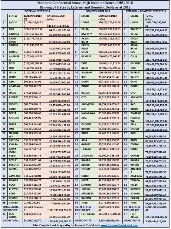 3. In a meticulous investigation just concluded by a team of Economic Confidential researchers on Annual High Indebted States (AHIS) on External and Domestic Debt, the amount owed by Lagos State represents about twenty (20) percent of the total debts owed by the 36 states and the Federal Capital Territory (FCT) which is N5.376 trillion in 2018.