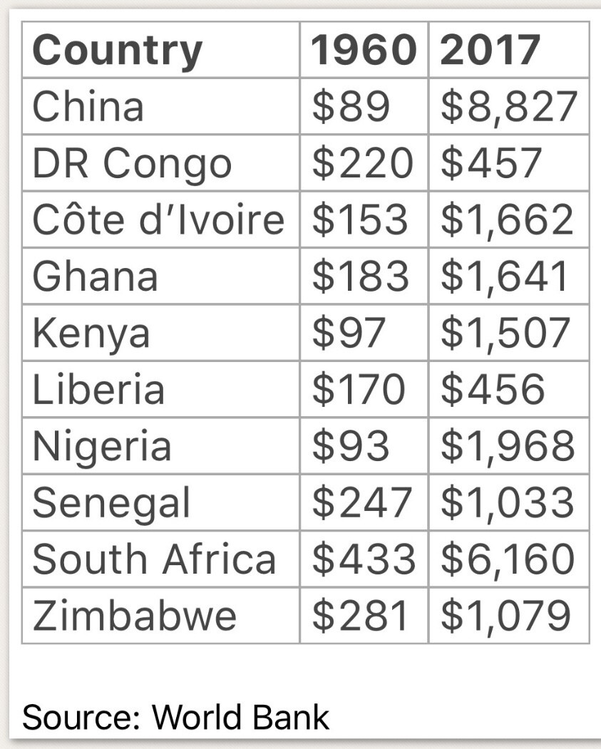 As shown in Table 1, per capita income in China in 1960 was US$89. Congo, Cote d’Ivoire, Ghana, Kenya, Liberia, Nigeria, Senegal, and South Africa were all richer than China.