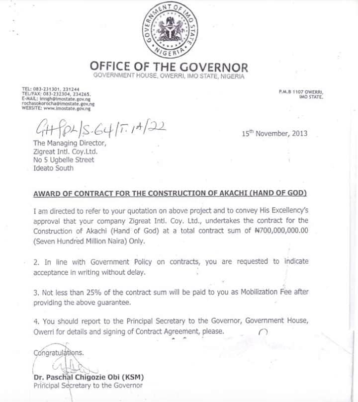 “I am directed to refer to your quotation of the above contract and to convey His Excellency’s approval that your company Zigreat Intl. Coy. Ltd. undertakes the contract for the Construction of Akachi (Hand of God) at a total contract sum of #700,000,000.00 (Seven Hundred Million Naira) Only,” the letter read.