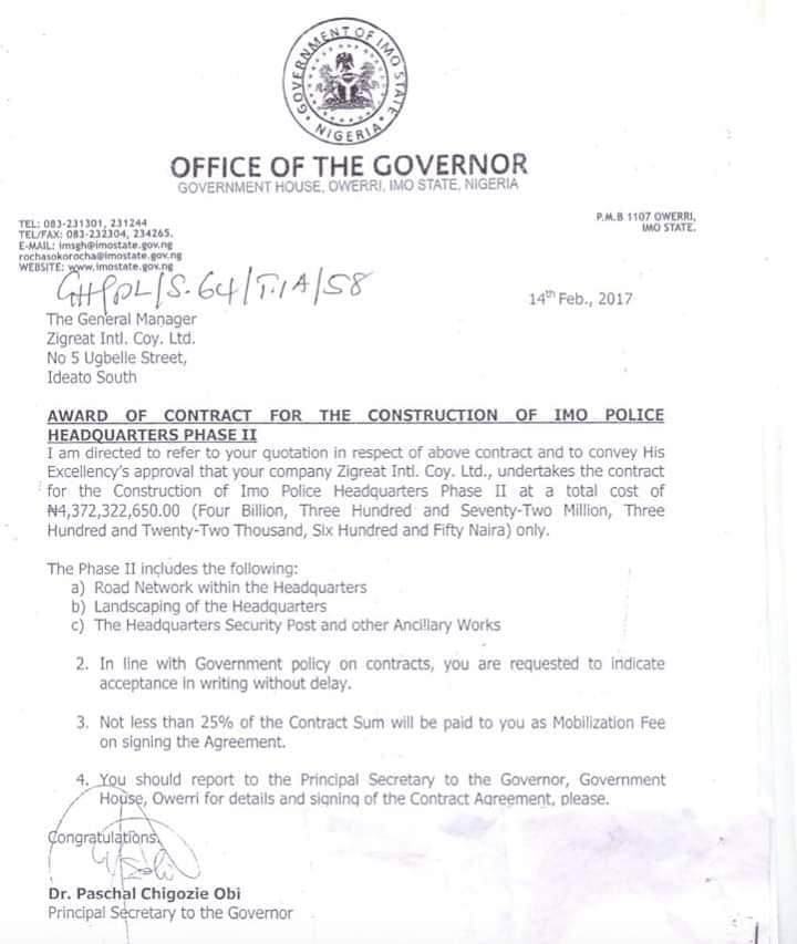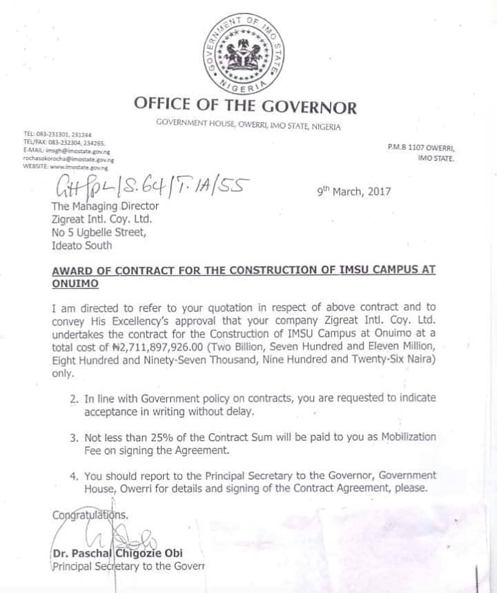 “In line with Government Policy on contracts, you are requested to indicate acceptance in writing without delay. You should report to the Principal Secretary to the Governor, Government House, Owerri for details and signing of Contract Agreement, please.”
