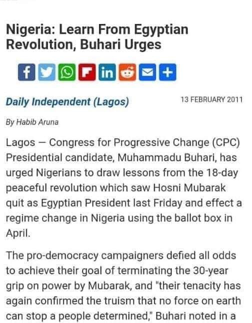 That was precisely the sort of “revolution” Buhari praised in Egypt and which he enjoined Nigerians to emulate. The Arab Spring was not a revolution through the ballot box, as his defenders are insisting; it was a series of unrelenting, organized mass protests that caused the deaths of many people. It was its aftermath that birthed the pretense to democracy that was quickly thwarted in the country.