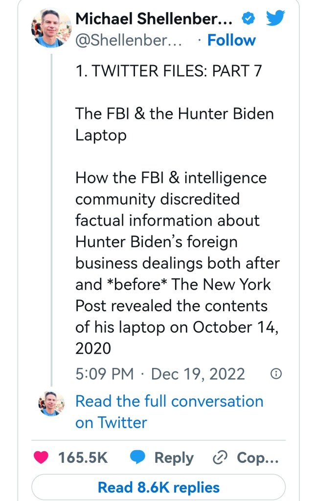 Perhaps the biggest single disclosure so far – confirming suspicions on the right – is that social media and state security agencies played a role in suppressing the so-called Hunter Biden laptop story weeks before the 2020 election.
