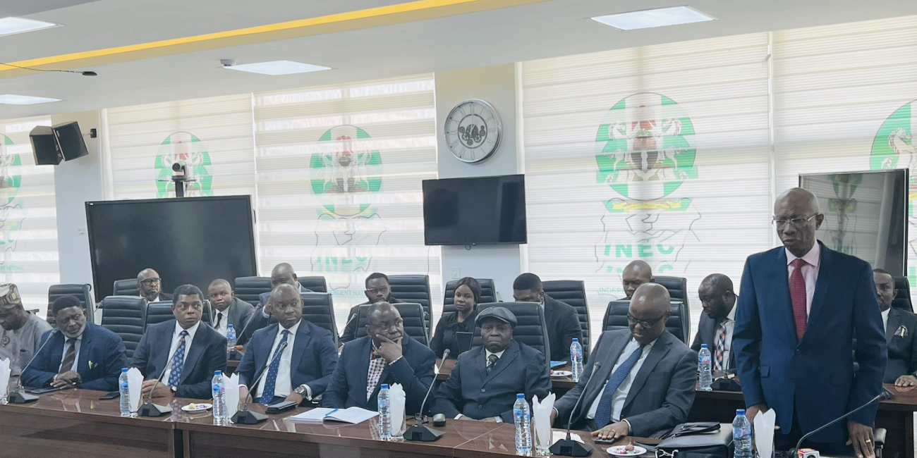 (Between Peter Obi lawyers led by Dr. Livy Uzoukwu and INEC chairman, Prof. Mahmood Yakubu, today at INEC office)