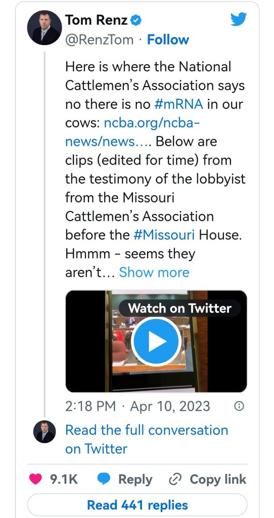 What’s causing significant confusion on this issue is a statement made by National Cattlemen’s Beef Association lobbyist Shannon Cooper before the Missouri House. Cooper told the House members he had recently “double-vaccinated” his herd with “vaccinations that have this mRNA.” According to Cooper, the mRNA “vaccine” given was for bovine respiratory disease.
