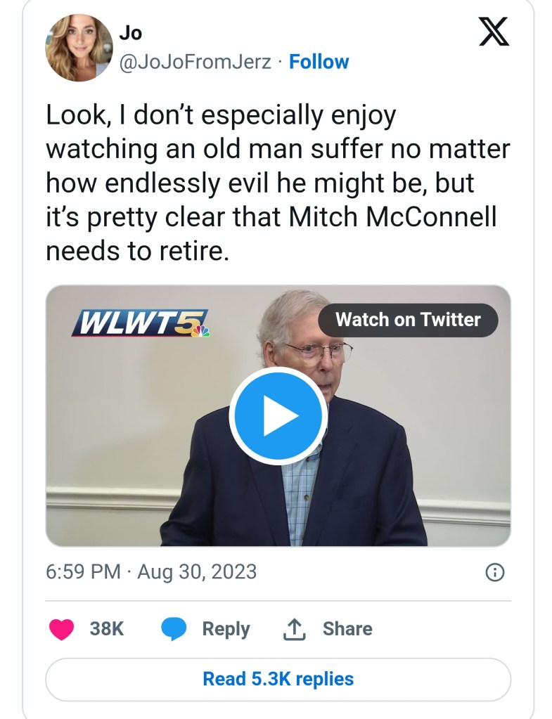 Below the General Secretary of the USSR, political authority was held by the Supreme Soviet, a parliament generally portrayed in the West as a rubber-stamp body filled with corrupt, elderly time-servers, who mostly just approved the political decisions made by the figures who quietly pulled their strings. Such harsh criticism was probably correct, but is our own Congress today so very different? At the age of 81, Sen. Mitch McConnell has led the Republicans in the Senate for the last 16 years, and probably ranks as one of the two most powerful Republican leaders in America. But a few days ago, he revealed his inability to respond to a simple question due to a “brain freeze,” as shown in a video clip that drew many millions of views on Twitter.