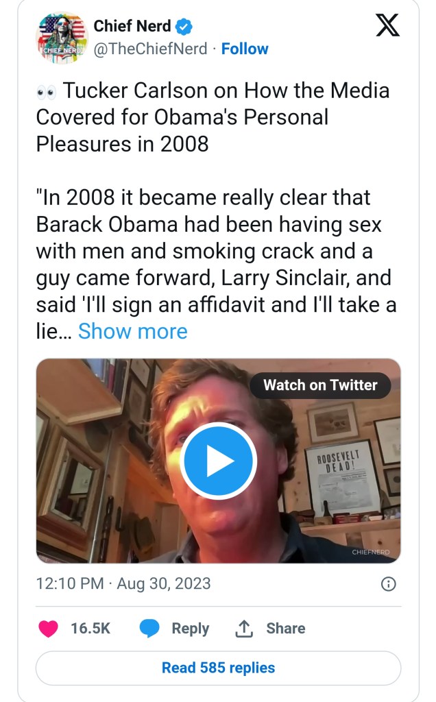 By a wide margin, Tucker Carlson is the most popular media figure for Republicans and conservatives, and his Trump interview on Twitter attracted some 15 million video views, an audience far larger than the one that had watched the Republican Presidential debate held around the same time. A few days ago Carlson said that he expected Trump’s political enemies will finally conclude that orchestrating his assassination is their best chance of preventing his triumphant return to the White House. In that same interview, Carlson casually mentioned that in 2008 it had become widely known in Washington media circles that Presidential Candidate Barack Obama had been having sex with men and smoking crack, but that no journalist, whether Democrat or Republican, was willing to report those astonishing facts to the oblivious American electorate.