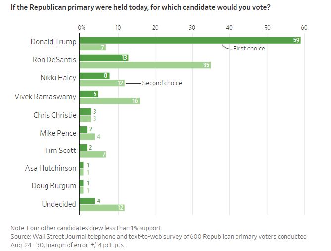 Trump himself had bitterly challenged that stolen election and as a consequence is facing some 90 felony counts in state and federal court that would put him away for 500 years. Yet on Friday the latest poll revealed that these charges had caused his Republican Presidential support to grow even stronger, now rising to 59% and putting him 46 points ahead of his nearest Republican primary rival.