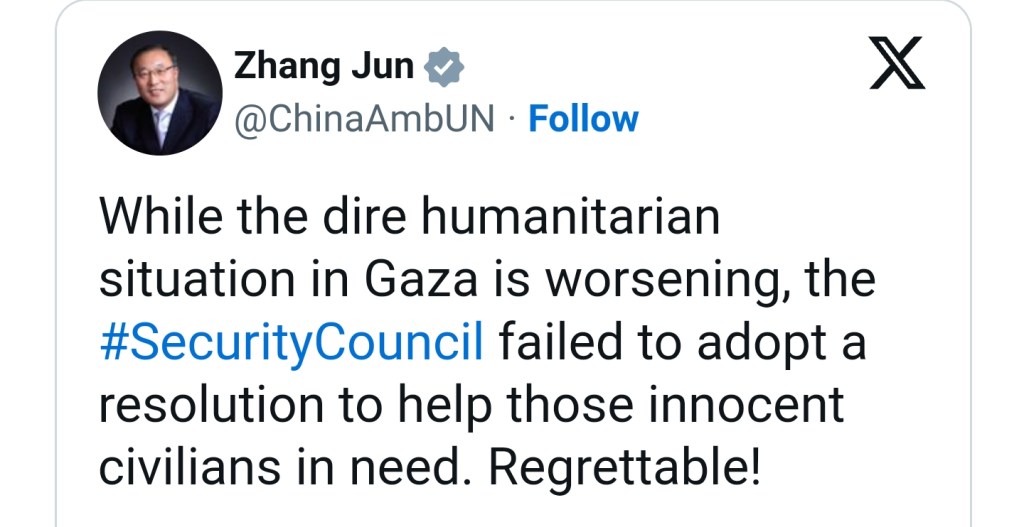 The Chinese representative said Beijing is “seriously concerned about the consequences of Israel imposing a complete blockade of Gaza,” and urged Israel to stop the “collective punishment of the population of Gaza.”