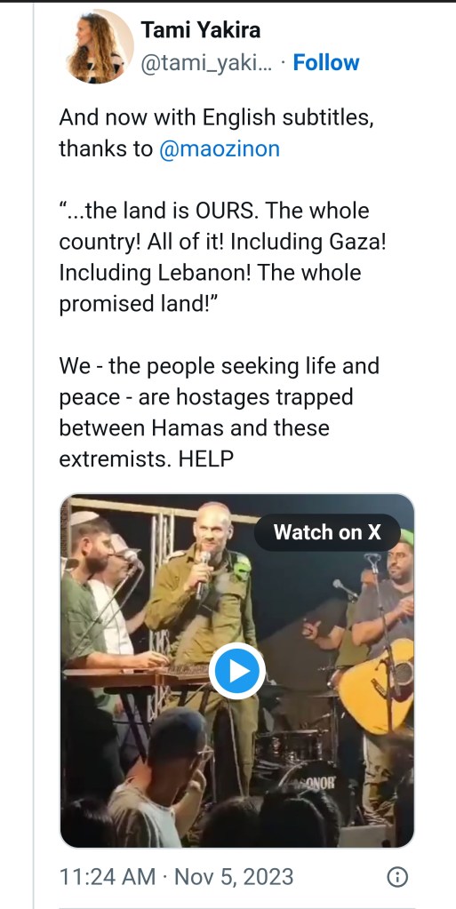 As the soldiers chant and cheer, he concludes that “the whole country” is “ours,” adding that he means “all of it … including Gaza, including Lebanon!