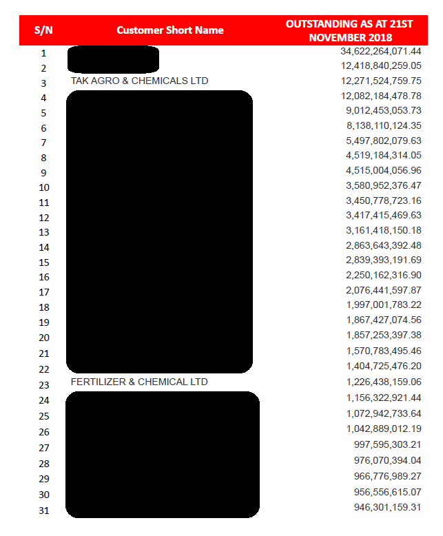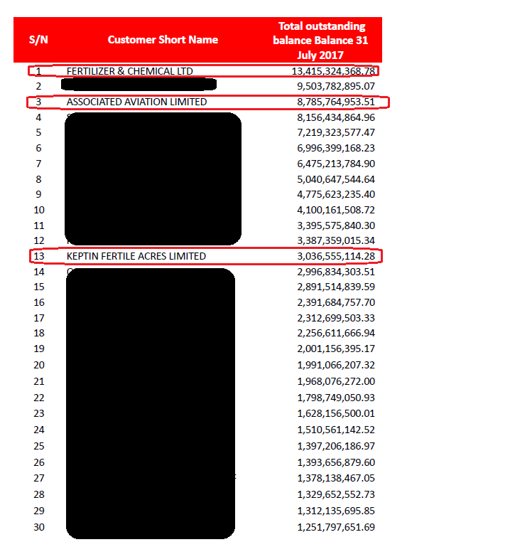 According to sources from within Unity Bank, Thomas Etuh appears to have treated Black’s “formula” as an instruction manual rather than a warning, and the inevitable disastrous outcome is imminent. Etuh, according to these sources, was singlehandedly responsible during his tenure, for inflating the bank’s number of Non Performing Loan (NPL) accounts to over 20,000, coming to a total NPL balance of more than N400 billion by the time he retired. Of this unfathomable number, at least 7 seven companies directly owned by or linked to Etuh alone were responsible for more than N29 billion worth of NPLs that would later be wiped off the books using financial sleight of hand. The following images are excerpts from large data files passed across to West Africa Weekly containing the comprehensive list of NPLs shortly before Etuh’s retirement from the board in 2017.