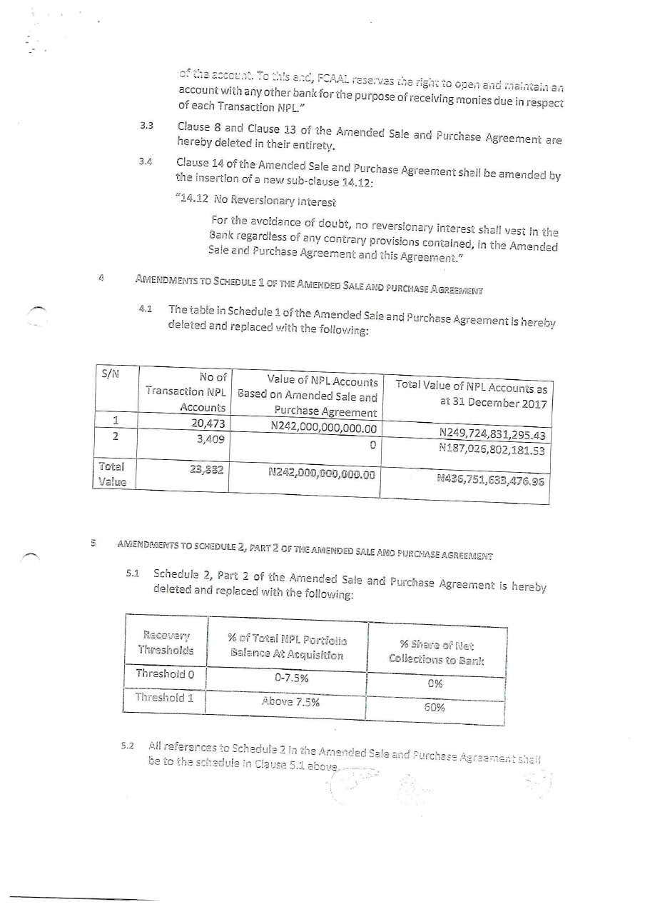 FCAAL by the way, is also closely linked to Etuh according to sources at the bank. What this means is that after personally taking nearly N30 billion out of the bank whose board he chaired, in the process inflating its NPL portfolio well past every regulatory limit in Nigerian jurisprudence, Thomas Etuh and his associates at FCAAL would then use a fraction of what he took out of the bank to buy its loan portfolio worth approximately 37.6 times more than what they paid for it. In addition, all collateral used to secure these loans were also taken over by FCAAL in the deal, making it a double loss for Unity Bank and a double gain for Etuh and FCAAL. But he wasn’t done yet. The sales agreement was modified in May 2017 to account for, among other things, the expected value of the NPL portfolio by the end of that year. At the stroke of a pen, the value of the loan portfolio sold to FCAAL went up 44 percent to N436,751,633,476.96 – but the price paid by FCAAL did not change.