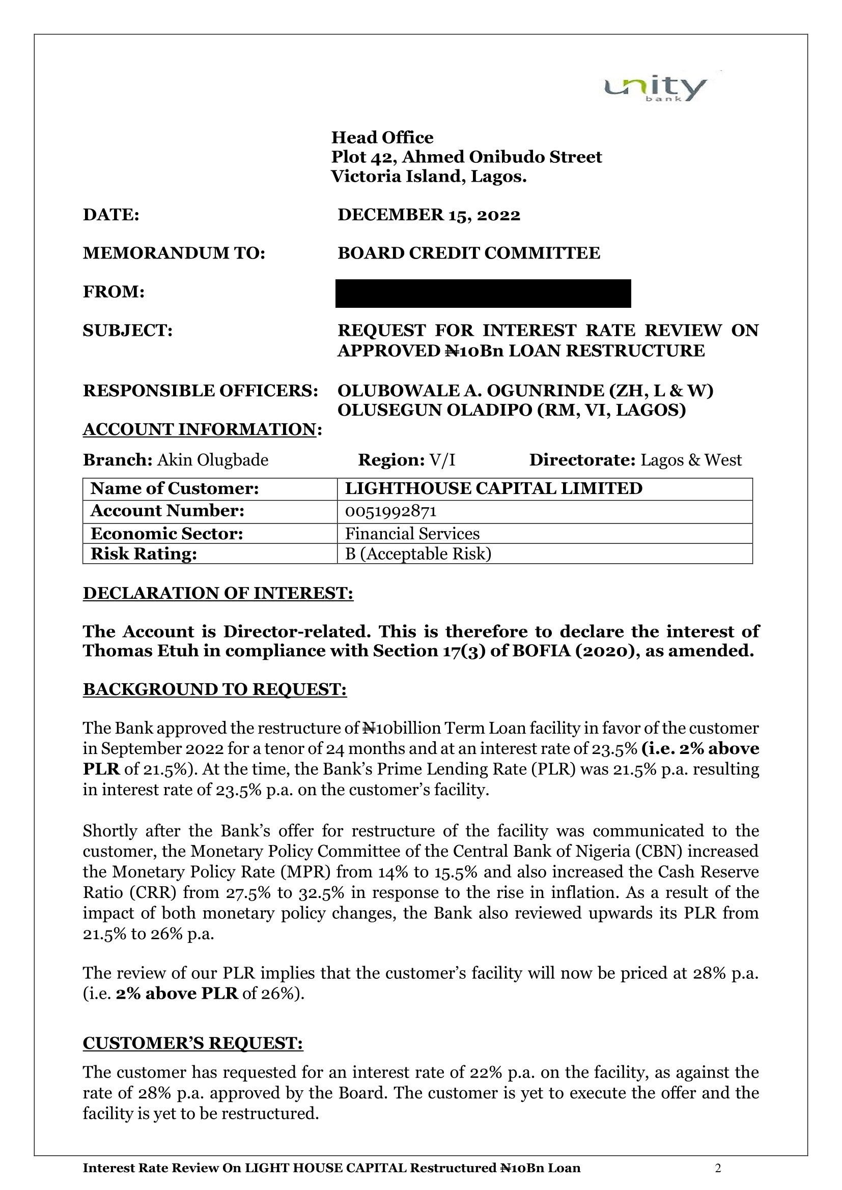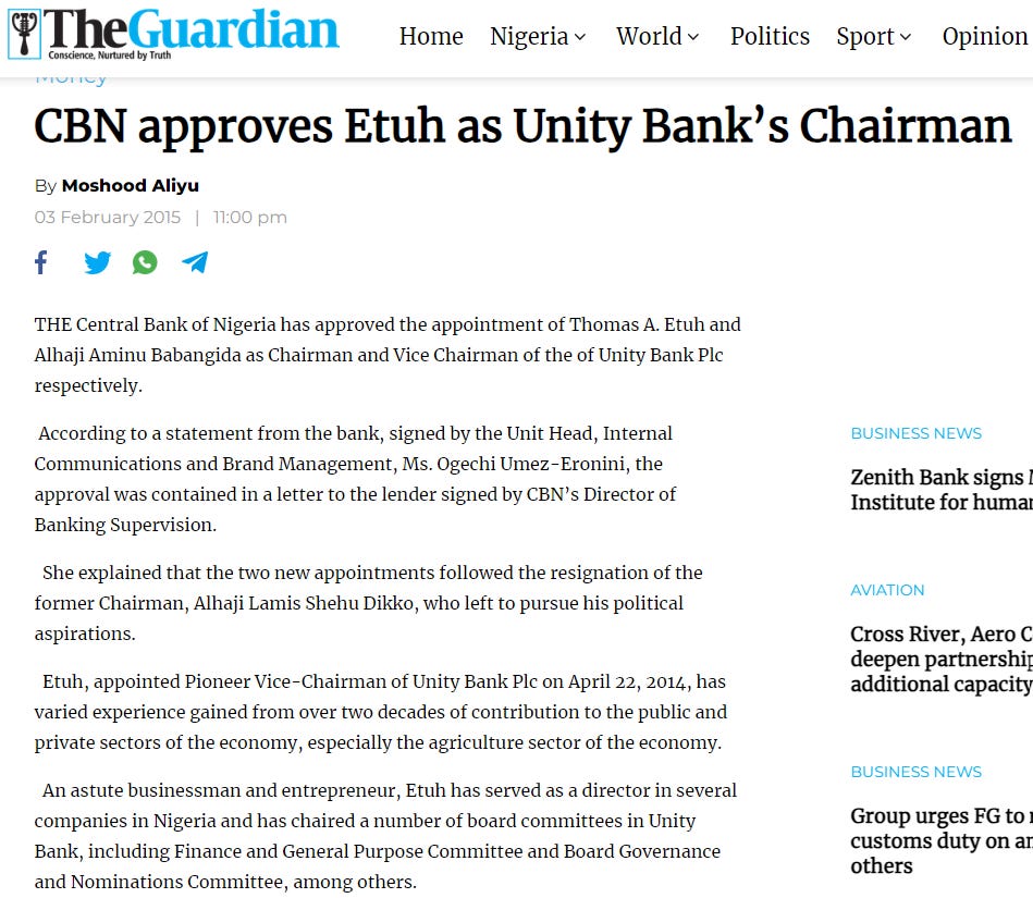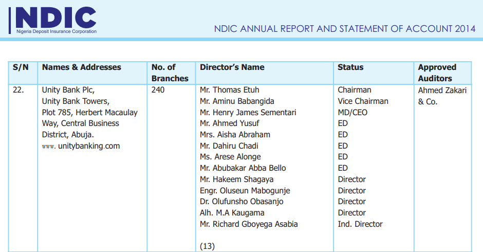 - Are there other directors of Unity Bank who are beneficiaries of these loans to Thomas Etuh, which is an incentive for their continued breach of the regulatory limit on insider loans?