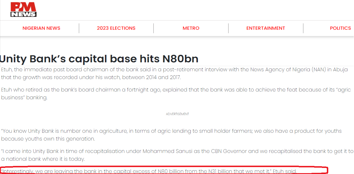 It is important to point out that the sale of Unity Bank Loans to Frontier was under the pretence that it was helping the NPL of the bank. That is far from the truth because Thomas Etuh, who is responsible for the majority of the NPLs, has created fresh NPLs in the bank. The major reason for the sale was to cover up the huge NPL belonging to Thomas Etuh. Note also that the loans and its collaterals were grossly undervalued with no reasonable revenue generated from the sale (N400bn loans sold for N6bn.) Moreover, the sale eroded the bank’s capital, throwing it deeply into the red. In addition, Frontier Capital has made very little recovery most of which were at ridiculous concessions because it did not pay any reasonable considerations for the loans.