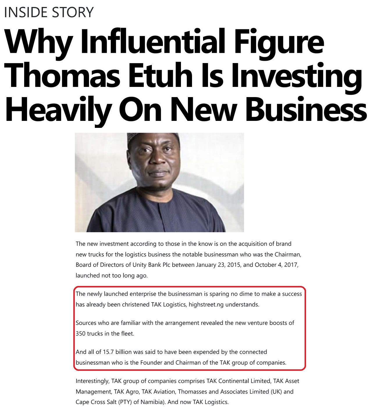 He is the Chairman at Veritas Kapital Assurance Plc and Founder of the TAK group of companies, a multibillion naira conglomerate spanning Agriculture, Logistics, Asset Management, Aviation and Mining. His portfolio includes TAK Continental Limited, TAK Asset Management, TAK Agro, TAK Aviation, Thomasses and Associates Limited (UK) and Cape Cross Salt (PTY) of Namibia). Like many Nigerians of such considerable means, he made the jump from bank customer to bank insider, becoming the pioneer Vice-Chairman of the Unity Bank board of directors in April 2014.