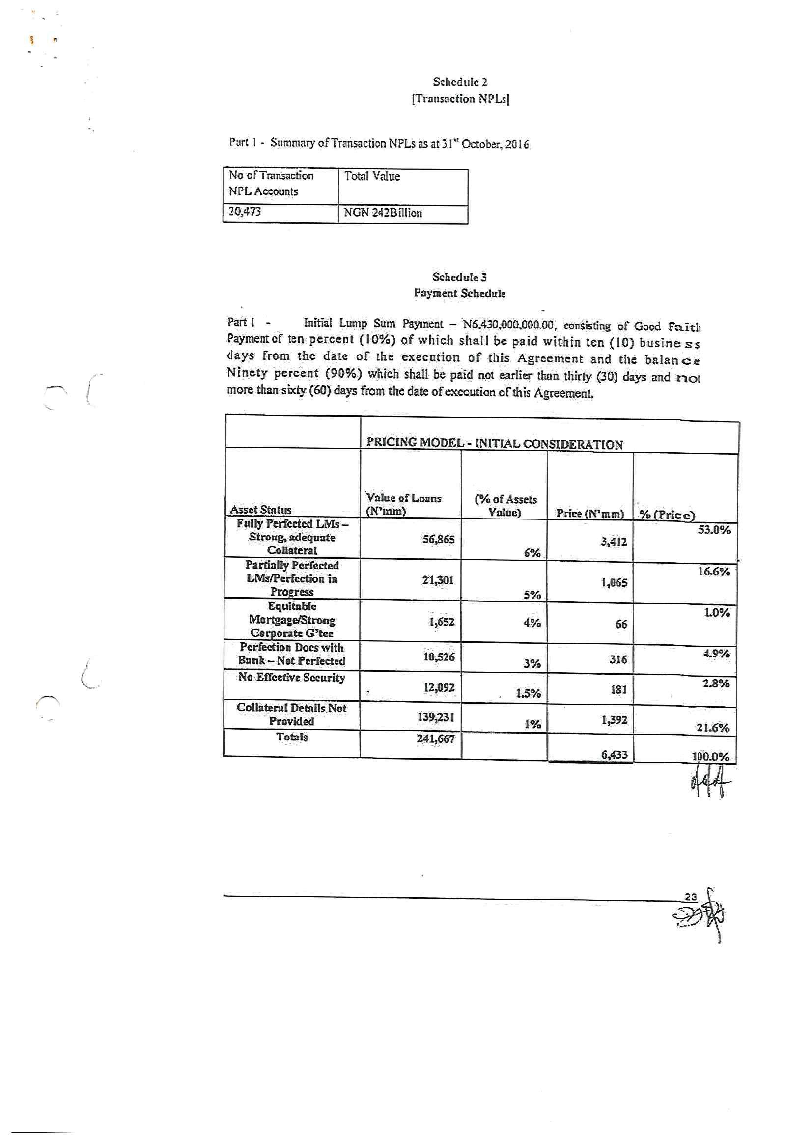 Fertilizer & Chemical Ltd, TAK Agro & Chemicals Ltd, SDEM Erectors Nigeria Limited, North East Gold Comm. Ltd, Keptin Fertile Acres Limited, Yam International (NG) Limited and TAK Continental Ltd are some of the Etuh-linked entities on this list of NPLs, as identified by bank insiders to West Africa Weekly. Entities linked to Etuh alone were responsible for a double digit percentage of all non performing loans on the bank’s books. Recognising that this would become a problem, Etuh’s next move was either evil genius or just plain evil, depending on your perspective. In December 2016, Unity Bank under his leadership struck a sales agreement with a company called Frontier Capital Alternative Assets Limited (FCAAL) to offload its total NPL portfolio – then worth N242 billion – for just N6.43 billion. You can access the full sales agreement here.