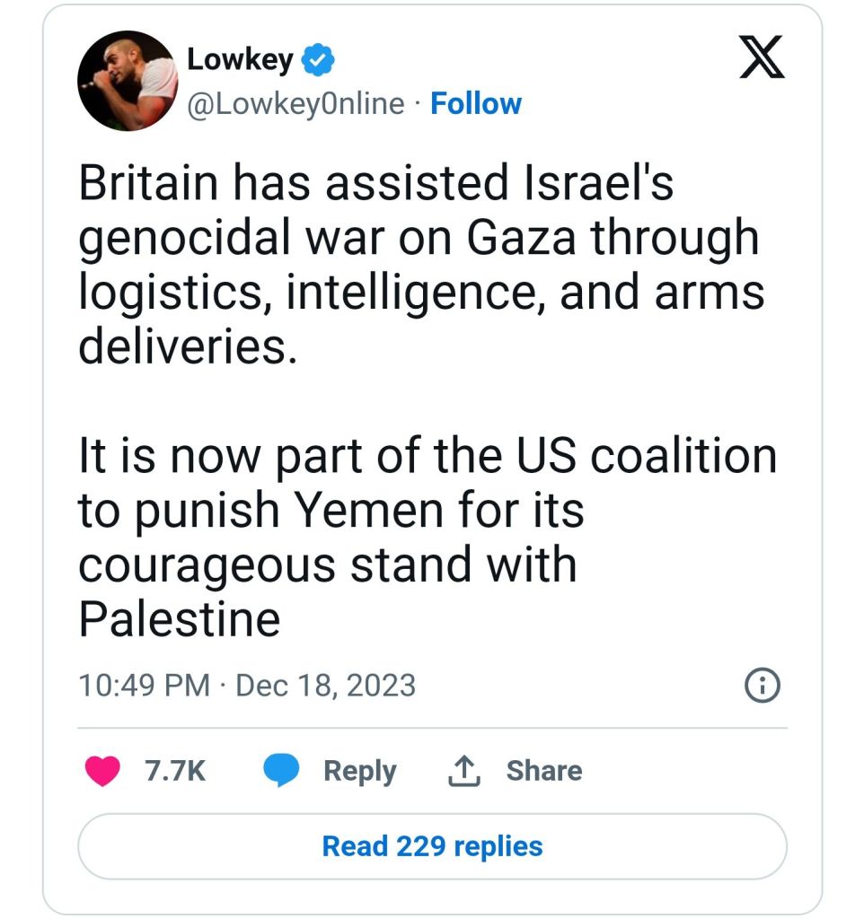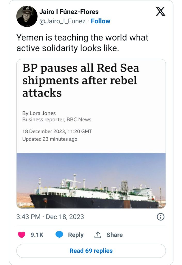 The Houthis are going to prevent Israel-bound commercial ships from reaching Israeli ports as long as Israel prevents food, water and medicine from reaching Palestinians in Gaza. If Israeli leaders want to end the blockade, they need to stop killing Palestinians and end the siege. This is the simple, moral solution to the current crisis in the Red Sea.
