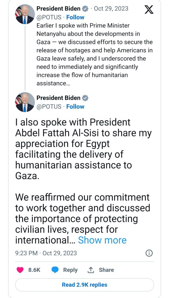 Moreover, after weeks of reports that the United States was attempting to raise the possibility of moving Palestinians to Egypt as part of a “humanitarian corridor,” U.S. President Joe Biden asserted yesterday that he and Sisi were committed to “ensuring that Palestinians in Gaza are not displaced to Egypt or any other nation.”