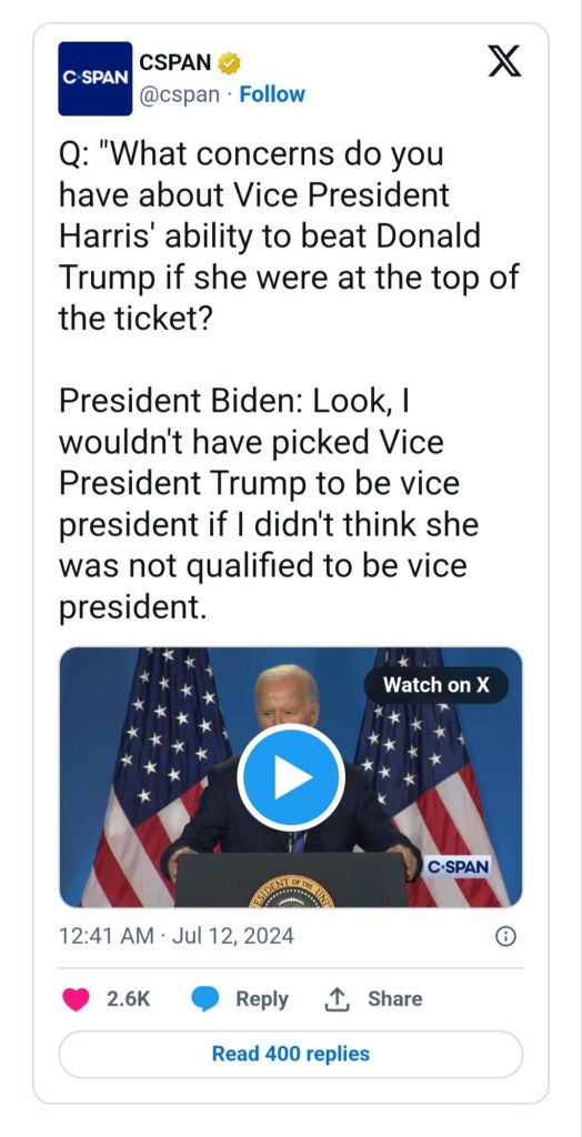 At thePress Conference, Biden called his own Vice President Kamala Harris, “Vice President Donald Trump,” (see below) at a time when he had to prove to the world that he was fit to serve another four years in office.